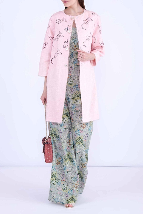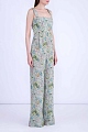 Легкий комбинезон приталенного силуэта из коллекции Valentino. Модель выполнена из тонкого шелка светло-зеленого цвета и украшена оригинальным цветочным принтом. Комбинезон с брюками прямого кроя и вырезом горловины "каре" с широкими бретельками. Застежка осуществляется на потайную молнию и крючок. Сделано в Италии.