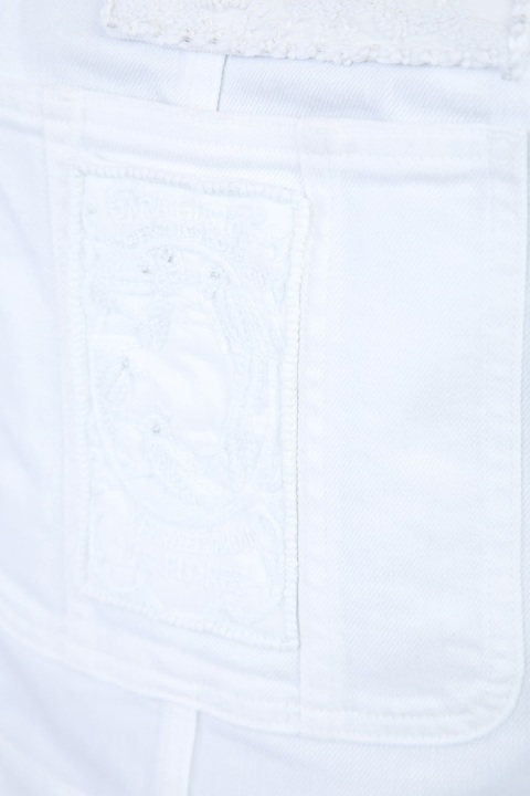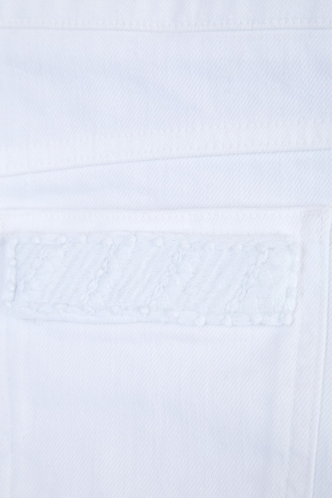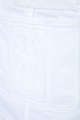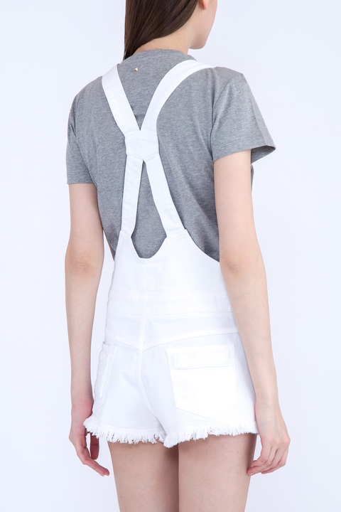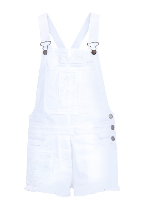 Лаконичный женский комбинезон из коллекции Valentino, выполненный из плотного хлопкового денима белоснежного цвета. Модель оформлена ручной вышивкой нитью в тон, отсылающей к мотивам, украшающим коробки кубинских сигар. Изделие с центральным нагрудным карманом и двумя боковыми карманами на шортах. Застёжка осуществляется на 3 пуговицы в боковом шве. Сделано в Италии.