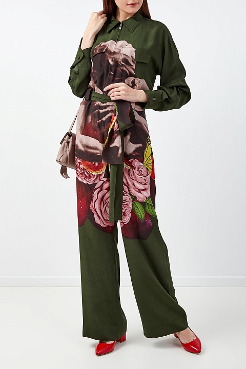 Комбинезон от Valentino из коллаборации с брендом Undercover полностью выполнен из летящего шелка. Принт разработан Jun Takahashi в присущем дизайнеру романтическом стиле и объединяет ключевые элементы коллекции — паттерны Graphic Lovers и Chain Rose. Лиф в стиле рубашки-oversize со спущенной линией плеч и накладными карманами. Съемный пояс-лента визуально структурирует силуэт, создавая акцент на талии. Детали: широкие брюки, золотистая застежка-молния. Сделано в Италии.