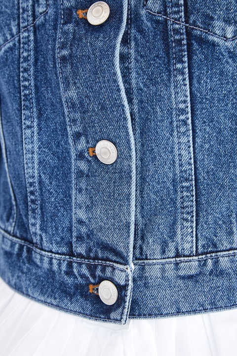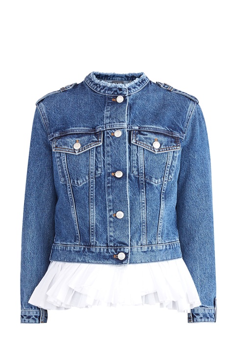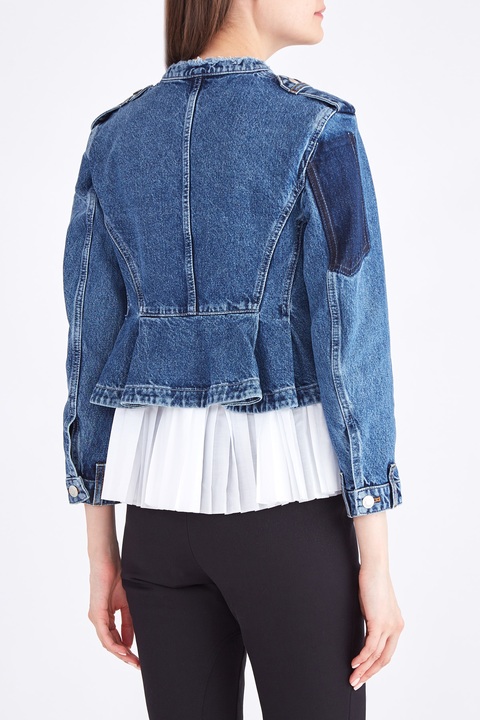 Оригинальная женская джинсовая куртка из весенне-летней коллекции Alexander McQueen выполнена из плотного хлопкового денима японского происхождения «Селвидж» в синем оттенке и дополнена прострочкой классического коричневого тона. Модель декорирована эполетами на плечах и манжетами рукавов, которые имитируют пояс с петлями для ремня, а также воротником-стойкой с бахромой по кромкам. Съемная баска из воздушной хлопковой вуали с крупными складками создает эффектную игру фактур и придает образу женственности. Изделие с застежкой на ряд брендированных металлических пуговиц. Сделано в Италии.