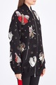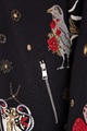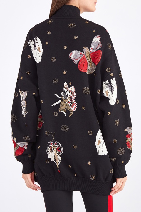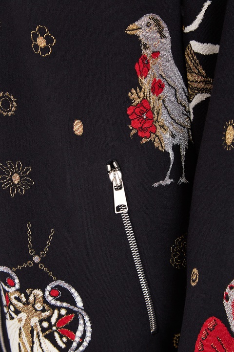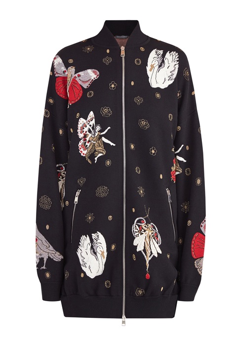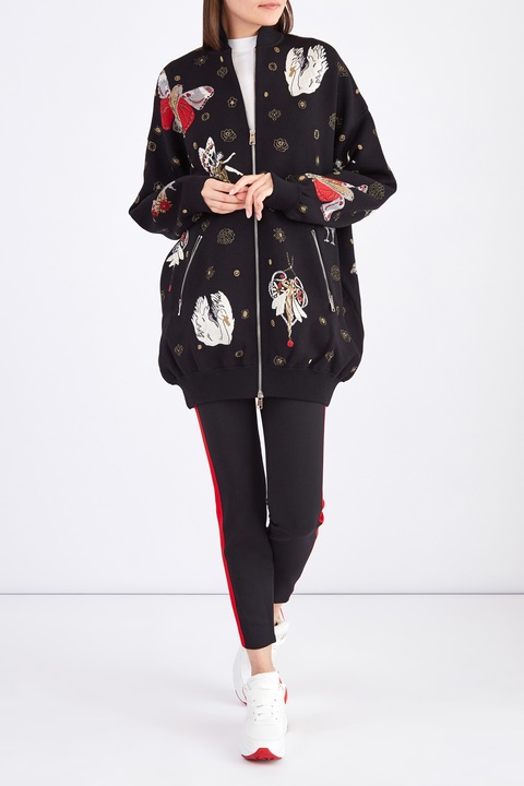 Оригинальная женская куртка-бомбер удлиненного кроя из коллекции осень-зима от Alexander McQueen создана из плотного шерстяного жаккарда черного тона. Особенностью модели стал декор вышивкой шелком, изображающей героев в духе готических сказок — отдельные элементы, выполненные металлизированной нитью, создают эффект игры света. Модель в стиле спортшик дополнена спущенной линией плеч, а ворот-стойка, манжеты и нижняя кромка окантованы эластичной резинкой в рубчик для придания силуэту аутентичного объема. Застежка-молния и два прорезных диагональных кармана завершают дизайн. Сделано в Италии.