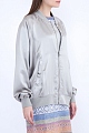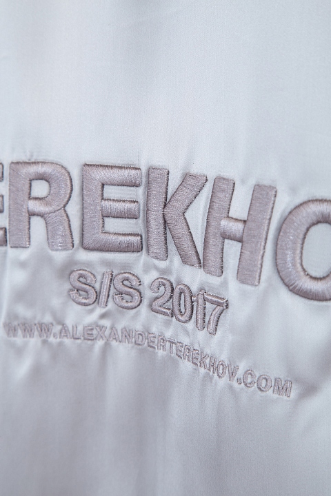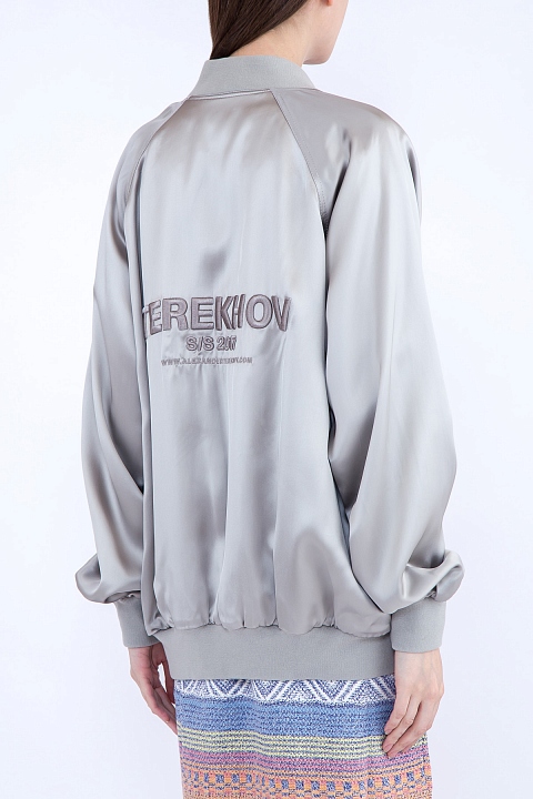 Женская куртка-бомбер Alexander Terekhov прямого кроя, выполненная из нежной струящейся вискозы с атласной поверхностью серебристого цвета. Модель с традиционными трикотажными манжетами, кромкой и воротом-стойкой. Изделие дополнено застежкой-молнией в центральной планке и боковыми карманами с клепками. Спинку украшают аппликации в виде символики бренда в тон. Сделано в России.