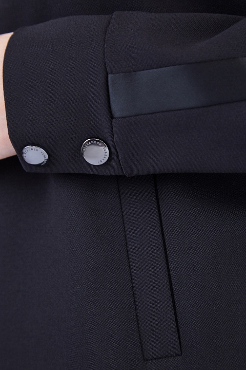 Лаконичная куртка-бомбер из коллекции Alexander Terekhov, выполненная из плотной шерстяной ткани черного цвета и декорированная атласными вставками-лампасами на длинных рукавах-реглан. Модель характеризуется прорезными карманами, аккуратным воротом-стойкой и манежами на клепках с символикой бренда. Застежка осуществляется на замок-молнию в центральной планке.