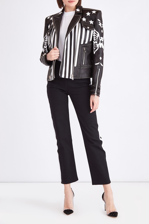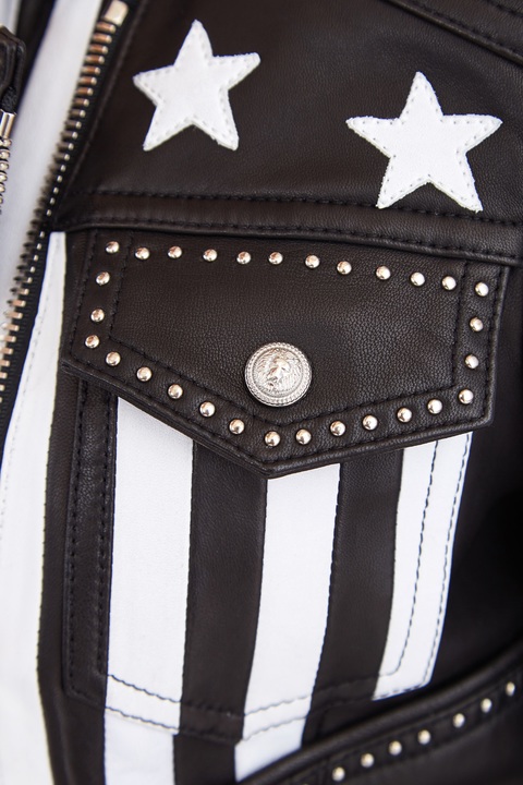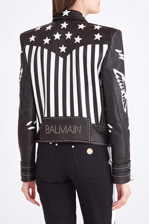 Эффектная женская куртка укороченного силуэта от Balmain создана из деликатной кожи ягненка мелкозернистой выделки в классическом черном цвете. Модель дополнена контрастными нашивками в тематике традиционных американских символов, присущей весенне-летней коллекции. Изделие в байкерском стиле, который находит свое отражение в массивных молниях на карманах, разрезах рукавов с аутентичными ремешками и двойной застежке, а также в декоре округлыми заклепками и акцентной линии плеч. Фурнитура оттенка серебра подчеркивает смелый дизайн, а подкладка из хлопка и вискозы обеспечивает посадку по фигуре. Два прорезных и два накладных кармана завершают образ.