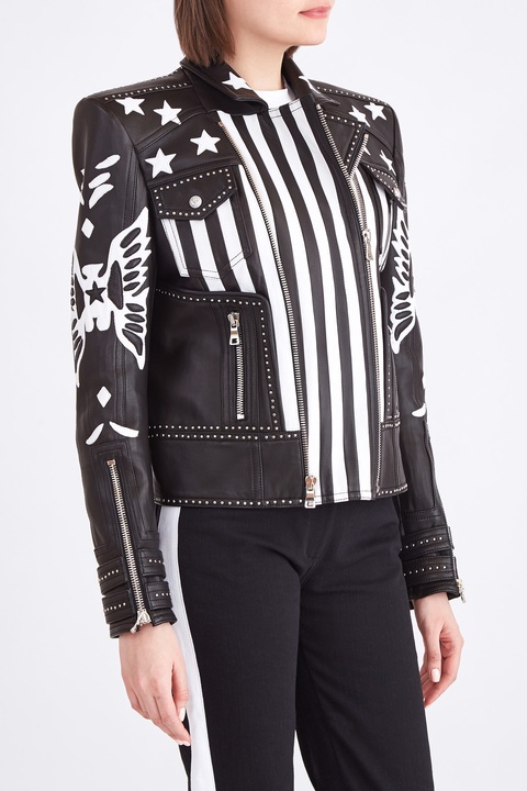 Куртка-косуха из кожи в стиле рок с интарсией и заклепками