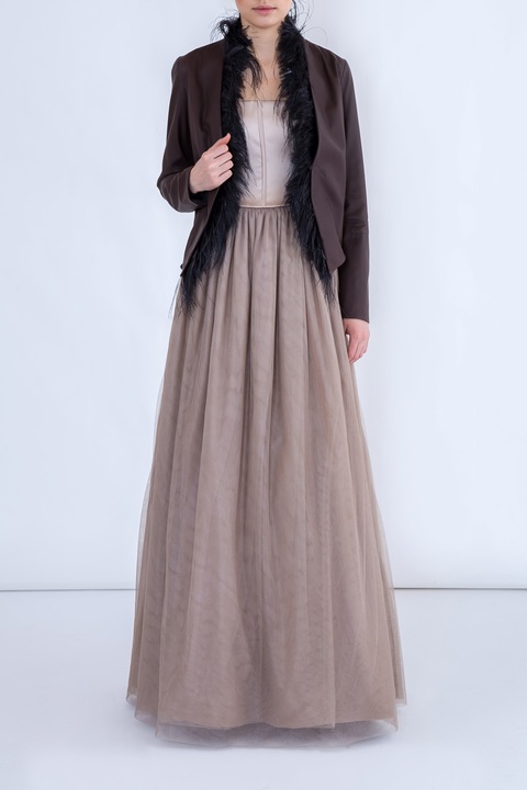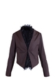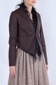 Оригинальная куртка-жакет Brunello Cucinelli свободного кроя. Модель выполнена из мягкой шлифованной кожи теленка темно-коричневого цвета. Изделие с глубоким V-образным вырезом горловины и асимметричной кромкой с остроконечным удлинением спереди. Изнутри ко всем кромкам пристрочены натуральные перья страуса. Застежка осуществляется при помощи крючка. Произведено в Италии.
