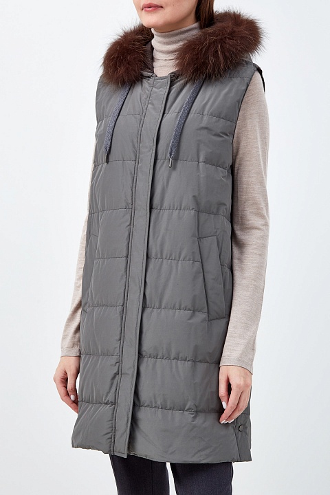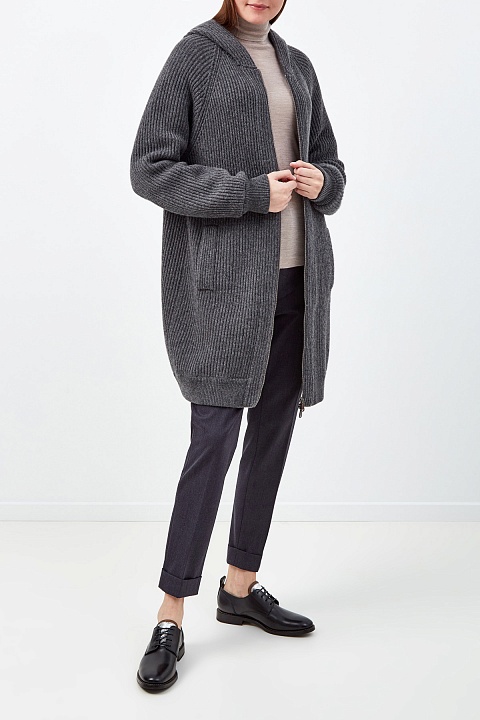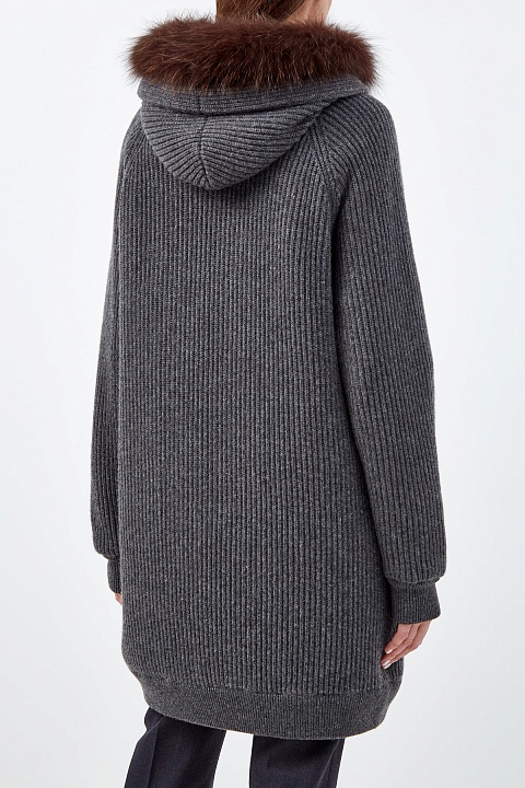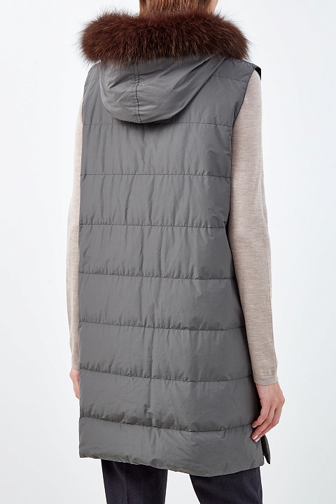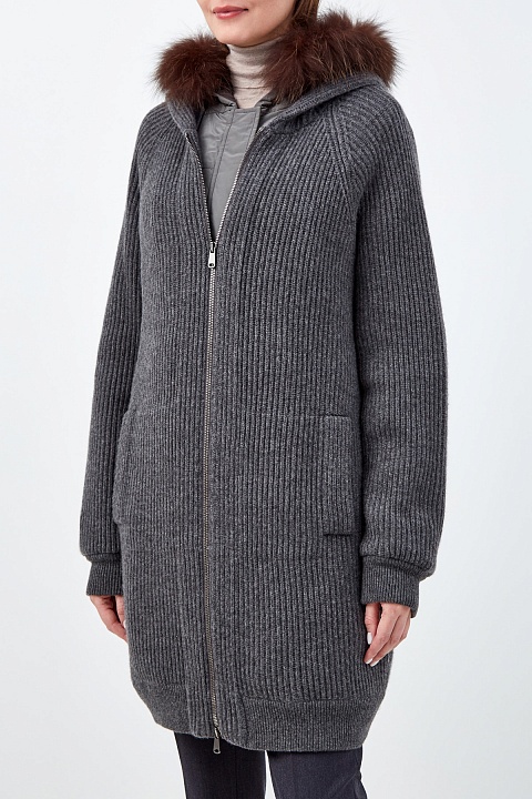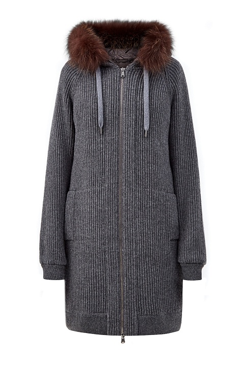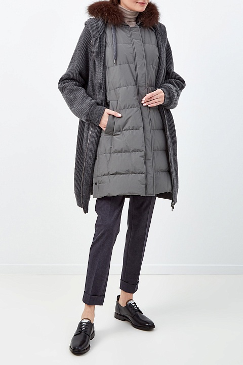 Куртка 2 в 1 от Brunello Cucinelli состоит из двух частей. Длинный кардиган из плотной кашемировой пряжи с глубоким капюшоном, застежкой-молнией и длинными рукавами на теплой подкладке сочетается с жилетом из хлопковой тафты. Капюшон дополнен съемной отделкой из меха лисы. Утеплитель — 55 гр пуха — обеспечивает легкий вес и согревающий эффект. Изделия можно носить вместе или раздельно, что делает модель особенно актуальной в условиях межсезонья. Длина жилета — 82 см, длина кардигана — 88 см. Сделано в Италии.