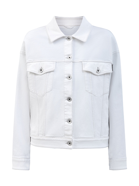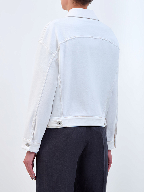 Женская куртка от Brunello Cucinelli сочетает ценные материалы и элементы в стиле casual. Модель создана из окрашенного вручную хлопкового денима — характерная диагональная текстура ткани подчеркивается контрастной прострочкой и застежкой на брендированные пуговицы из металла. Небольшая деталь из цепочки Мониль на накладном кармане придает изделию изящное сияние. Сделано в Италии.
