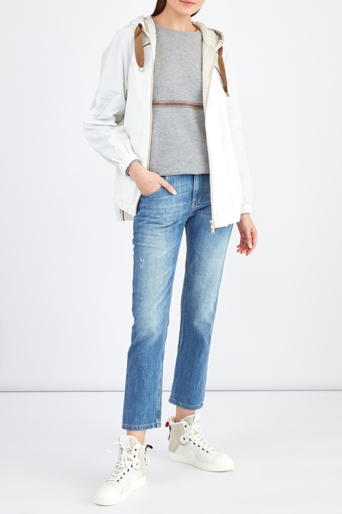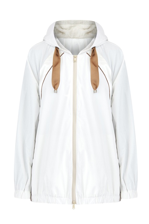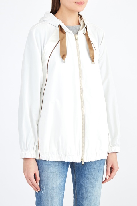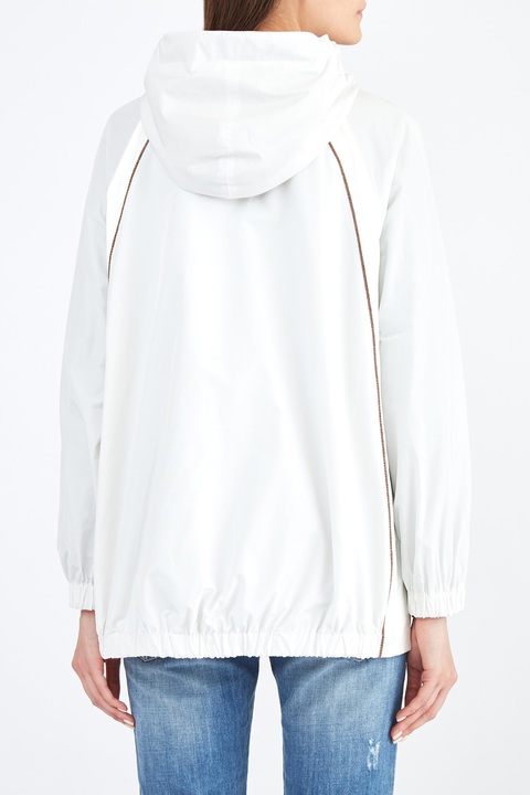 Женская ветровка от Brunello Cucinelli создана из легкой тафты натурального оттенка хлопкового бутона. Модель в спортивном стиле дополнена вставками из шелковистого атласа по боковым швам, а также отделкой в виде сверкающих рядов цепочек Мониль, которые формируют узнаваемый почерк Модного дома. Детали: капюшон на льняной подкладке с кулиской из репсовой ленты, рукава-реглан, кромки с эластичными вставками, асимметричный нижний край. Сделано в Италии.