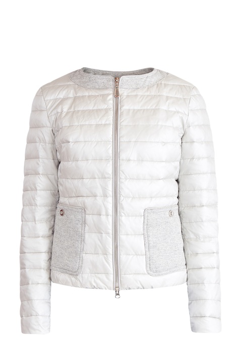 Женская куртка из весенне-летней коллекции Cudgi создана из ветронепроницаемой синтетической ткани в актуальном металлическом серебряном оттенке. Игру фактур создают детали из текстиля жемчужно-серого тона: окантовка круглого выреза горловины и материал накладных карманов. Приталенный крой обеспечивает посадку по фигуре, декоративные разрезы на рукавах придают образу динамики, а застежка-молния завершает изделие.
