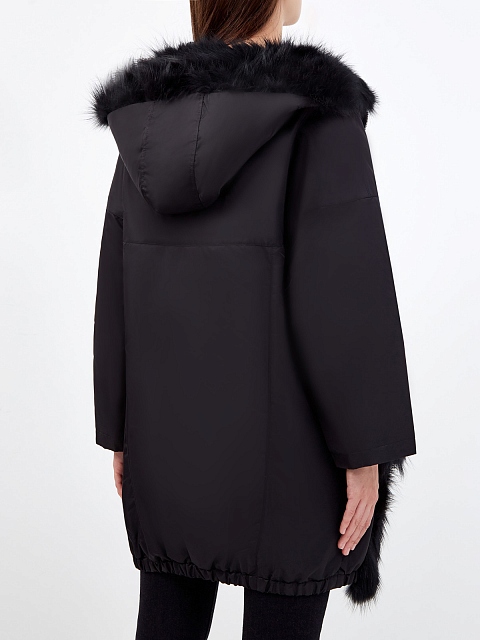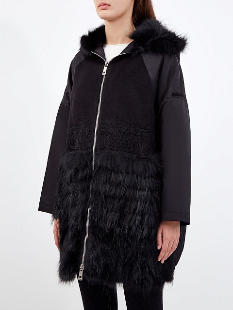 Удлиненная куртка от Ermanno Ermanno Scervino выполнена из водонепроницаемого нейлона в черном цвете. Фирменный штрих — планки из шерстяного драпа с кружевом ручной работы. Модель дополнена вставками из густого эко-меха, которая дополнительно утепляет капюшон и передние планки. Детали: прорезные карманы, эластичная отделка по нижнему краю, застежка на молнию, подкладка с утепляющим слоем. Сделано в Италии.