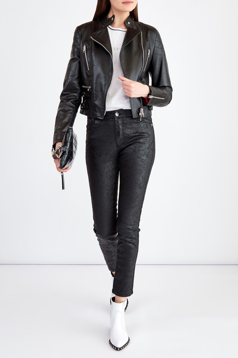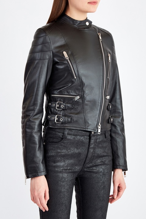 Укороченная куртка в стиле глэм-рок от Ermanno Scervino полностью выполнена из кожи ягненка мелкозернистой выделки с легким глянцевым эффектом по поверхности. Аутентичный образ создают массивные молнии, широкие ремни и стеганые вставки на рукавах. Подкладка с утепляющим слоем выполнена из атласа с ромбическим узором и аппликацией в виде монограммы бренда. Детали: фурнитура серебристого оттенка, хлястик на воротнике, асимметричная застежка. Сделано в Италии.