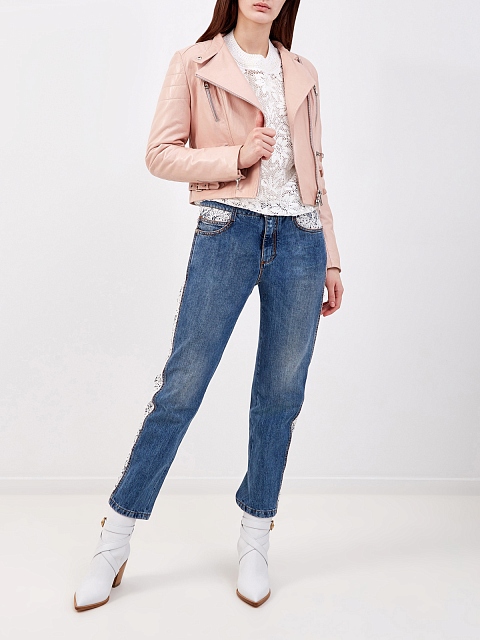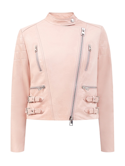 Элегантная куртка-косуха в пудровом оттенке от Ermanno Scervino создана из мягкой кожи с матовой поверхностью. Изделие в байкерском стиле дополнено массивными молниями, фурнитурой с серебристым напылением, а также асимметричной застежкой. Детали: отложной ворот, черная внутренняя подкладка со стеганым эффектом, укороченный крой. Сделано в Италии.