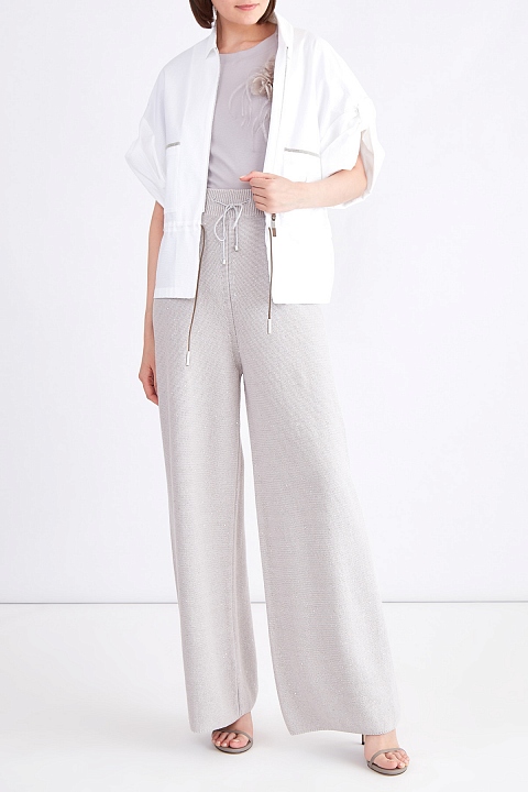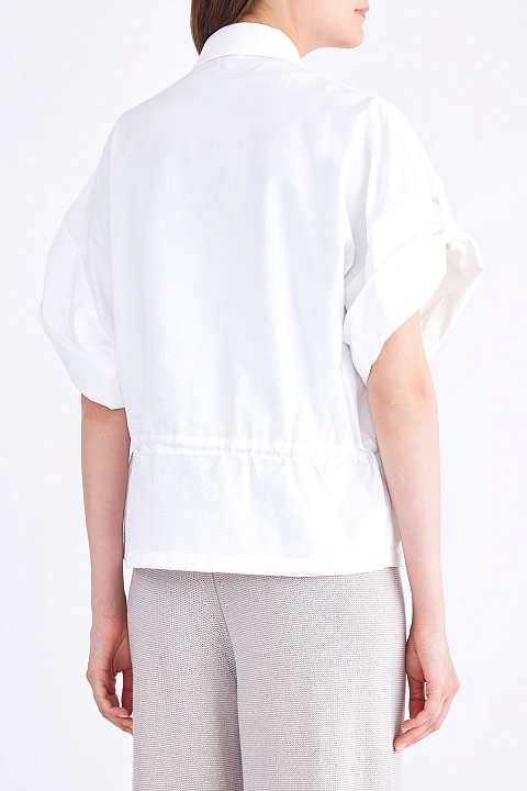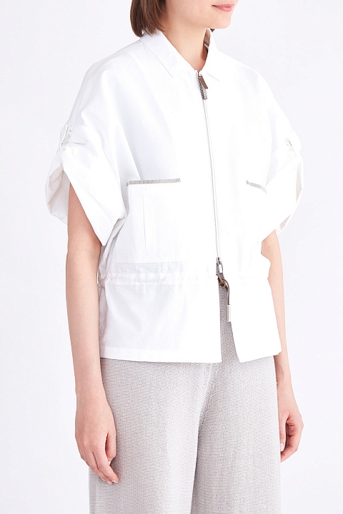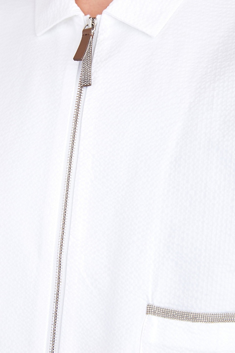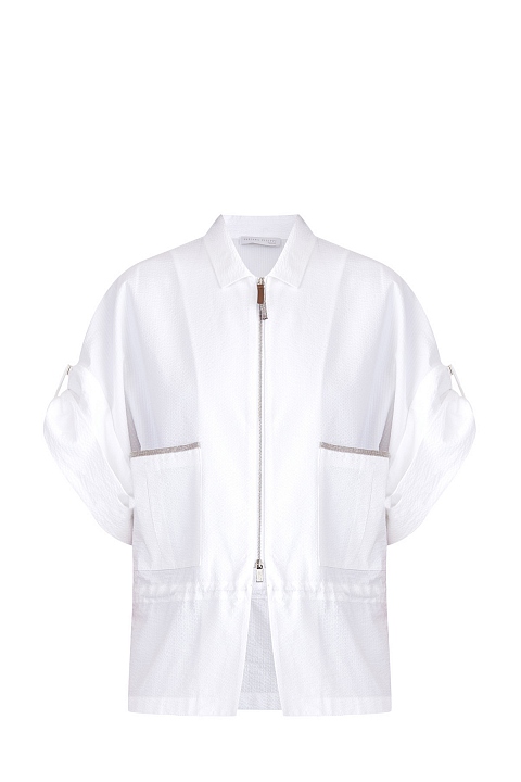 Ветровка Fabiana Filippi выполнена из легкого эластичного хлопка белоснежного тона с фактурным рифлением. Модель в присущим бренду расслабленном стиле дополнена широкими рукавами с объемными отворотами и застежкой-молнией. Накладные карманы декорированы фирменными круглыми бусинами и перекликаются с отделкой пулера молнии. Линия талии подчеркнута потайной кулиской с тонким кожаным шнуром внутри. Сделано в Италии.
