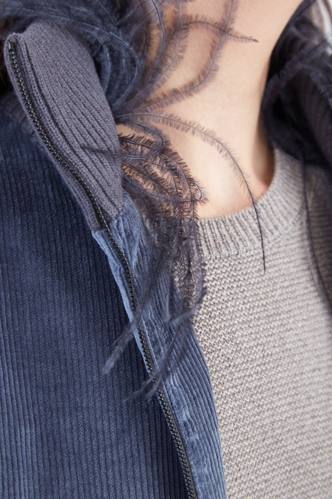 Куртка из вельвета в рубчик с трикотажными кромками и перьями страуса