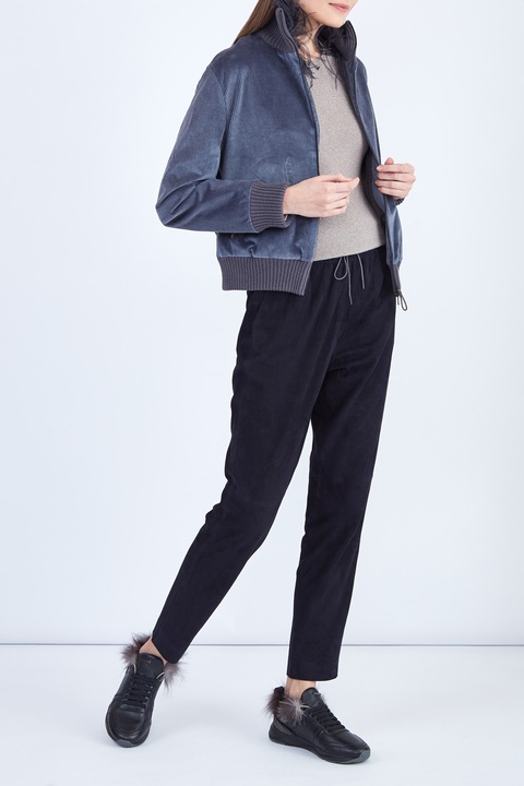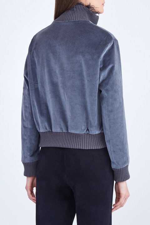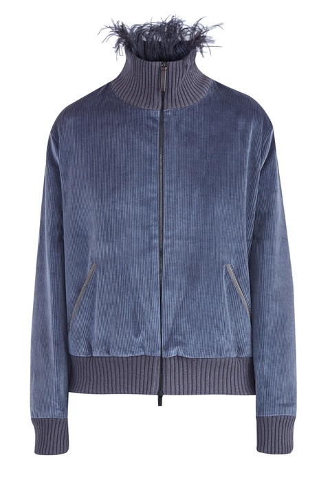 Стильная куртка от Fabiana Filippi создана из фактурного хлопкового вельвета в рубчик в серо-голубом оттенке. Кромки окантованы вязаной резинкой, выполненной из мягкой кашемировой пряжи, а высокий ворот оснащен съемной тесьмой с нашитыми вручную страусиными перьями. Изделие полностью на подкладке дополнено отделкой фирменными бусинами ювелирной огранки по кромкам карманов, линии застежки, а также пуллеру на молнии. Сделано в Италии.
