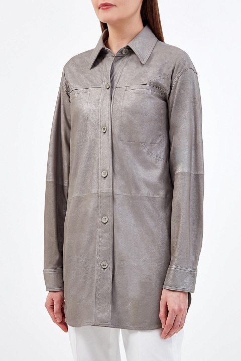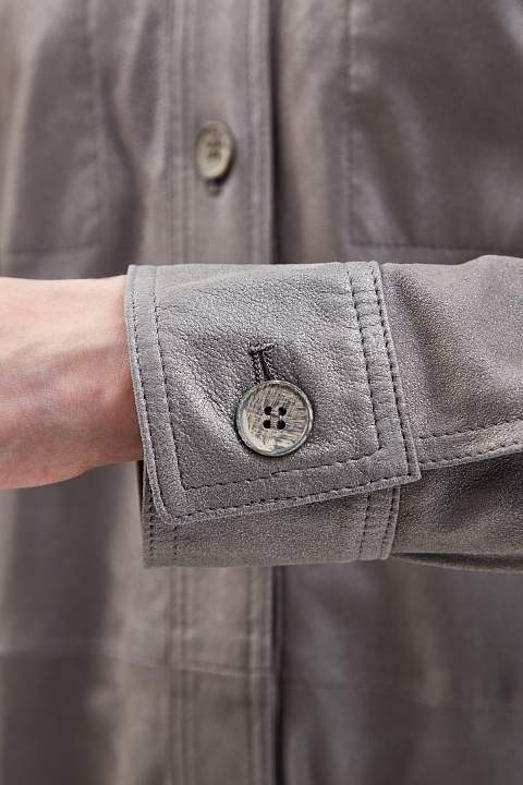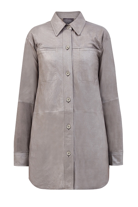 Удлиненная куртка от Lorena Antoniazzi полностью выполнена из шлифованной телячьей кожи. Напыление цвета черненого серебра подчеркивает мягкую матовую фактуру материала. Силуэт с отложным воротником и манжетами на рукавах заимствован у классической сорочки. Расслабленный стиль изделия подчеркивают закругленные нижние кромки. Детали: трикотажная отделка под воротником, символика бренда из перламутра. Сделано в Италии.