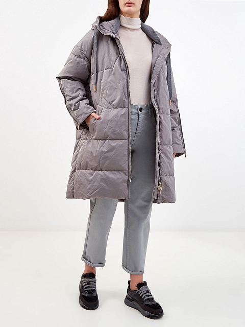 Удлиненная женская куртка от Lorena Antoniazzi выполнена из ветрозащитной ткани в пепельном оттенке. Фирменная трикотажная отделка ворота и утепляющий слой делают модель оптимальной для погодных условий межсезонья. Детали: глубокий капюшон на кулиске, регулируемые рукава, застежка на молнию с двойным пуллером, прорезные карманы. Сделано в Италии.