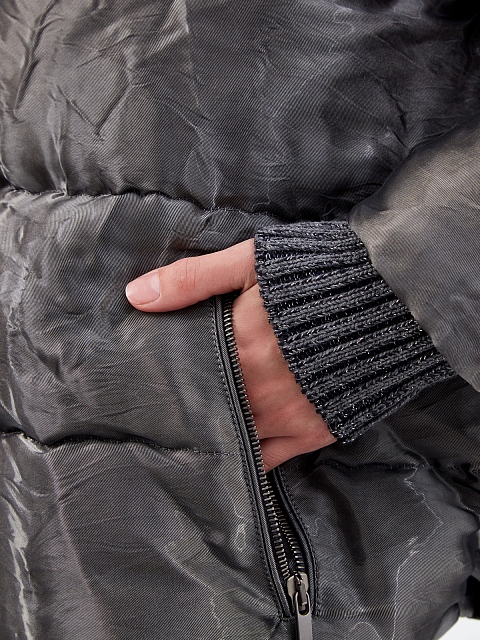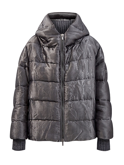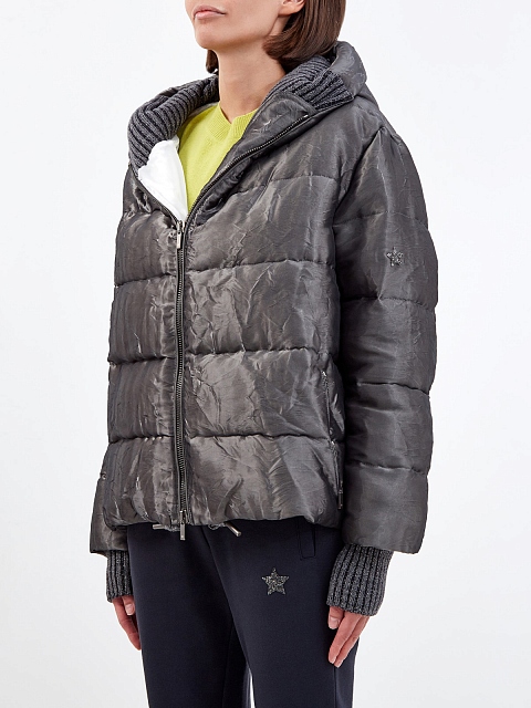 Куртка от Lorena Antoniazzi. Стальной серый оттенок подчеркнут глянцевой жатой текстурой ткани с эффектом водной глади. Нижний край оснащен кулиской для индивидуальной подгонки силуэта, а вязаные манжеты с нитью люрекса не позволяют холодному ветру проникать внутрь. Капюшон дополнен трикотажной отделкой в рубчик по внутренней стороне. Детали: карманы на молниях, логотип из кристаллов Swarovski. Сделано в Италии.