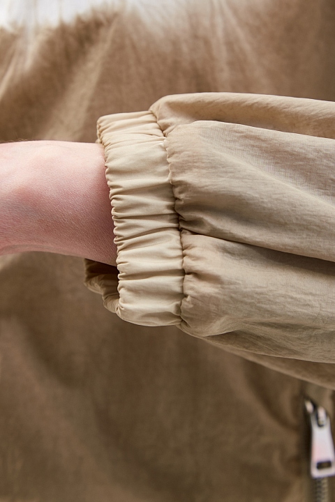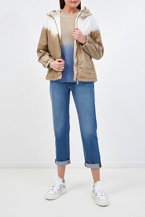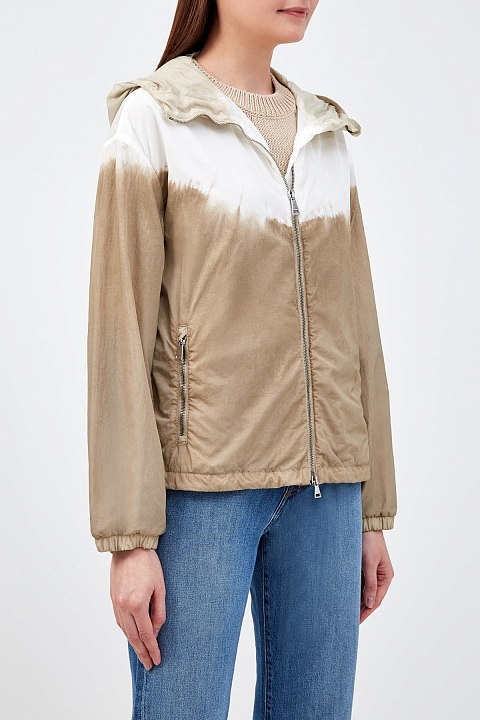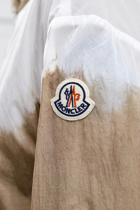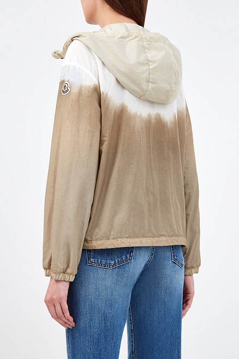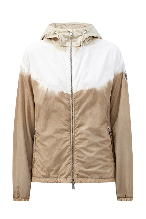 Ветровка Olive от Moncler из нейлона technique с жатым эффектом по поверхности. Окрашивание в технике тай-дай выполнено в универсальной молочно-кремовой гамме. Нижний край на кулиске и эластичные манжеты обеспечивают максимально плотное прилегание и дополнительно защищают от ветра. Детали: глубокий капюшон, воротник-стойка, два кармана, застежки-молнии, легкая конструкция без подкладки.
