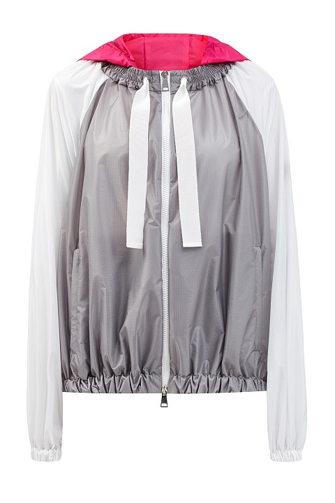 Ветровка из плотного влагостойкого нейлона Rip-stop от Moncler. Модель в стиле colorblock сочетает базовые тона с ярким оттенком фуксии. Эластичная отделка по краям придает силуэту объем и обеспечивает максимальное прилегание, предотвращая попадание холодного ветра внутрь. Детали: капюшон на кулиске, легкая конструкция без подкладки, рукава-реглан, застежка-молния, два кармана, нашивка из фетра.