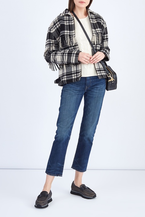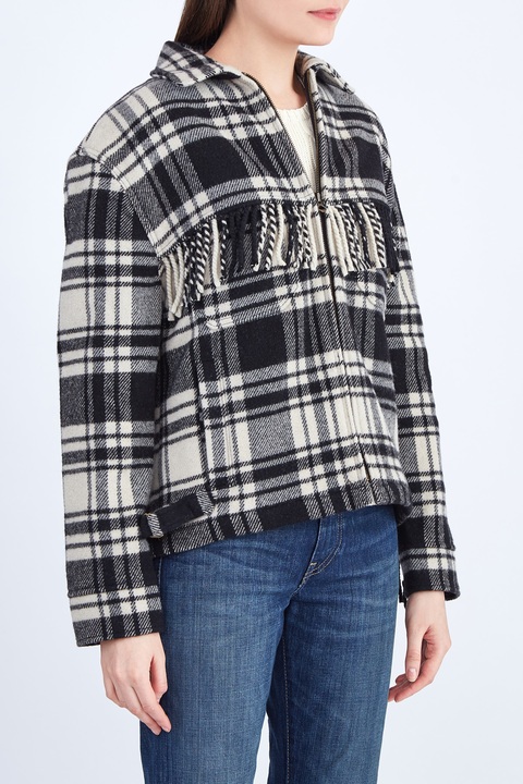 Женская куртка из коллекции осень-зима бренда Polo Ralph Lauren, созданная в классическом американском стиле, который прослеживается во всей коллекции бренда. Модель создана из плотной и теплой шерстяной ткани с ворсистой поверхностью, украшенной клетчатым узором в черно-белой гамме. Изделие дополнено отложным воротом, регулируемыми хлястиками по бокам и длинной бахромой в ковбойском стиле. Застежка осуществляется на молнию.
