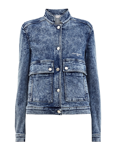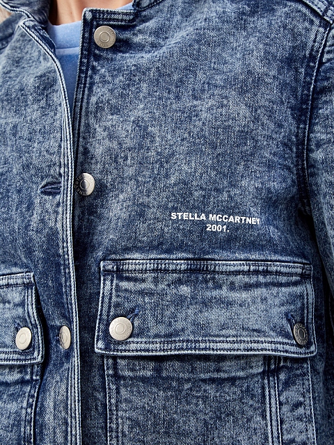 Куртка из денима от Stella McCartney. Плотный, и в то же время эластичный материал хорошо сохраняет форму и не стесняет движений. Неравномерное окрашивание с эффектом кислотной стирки придает образу расслабленное настроение, а ворот-стойка в байкерском стиле визуально структурирует образ. Детали: застежка на пуговицы, двойные карманы, логотип-аппликация.