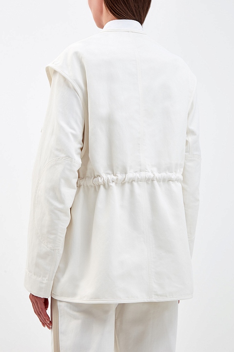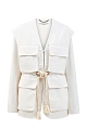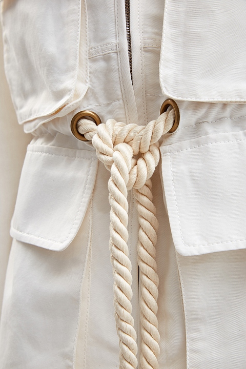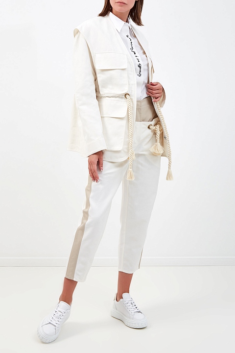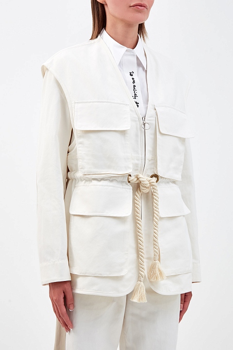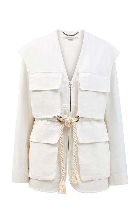 Женская куртка в стиле сафари Ania Compact от Stella McCartney выполнена из хлопкового твила в молочно-белом оттенке. Волокна льна в составе изделия обеспечивают максимальный комфорт в летний сезон. Модель дополнена объемными накладными карманами. Пояс в виде плетеного шнура с мягкими кисточками позволяет по желанию регулировать силуэт. Детали: V-образный вырез, застежка на молнию, вставки из плотного текстиля на рукавах.