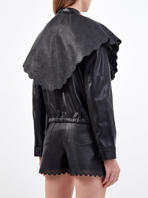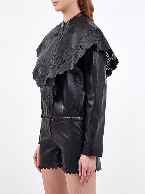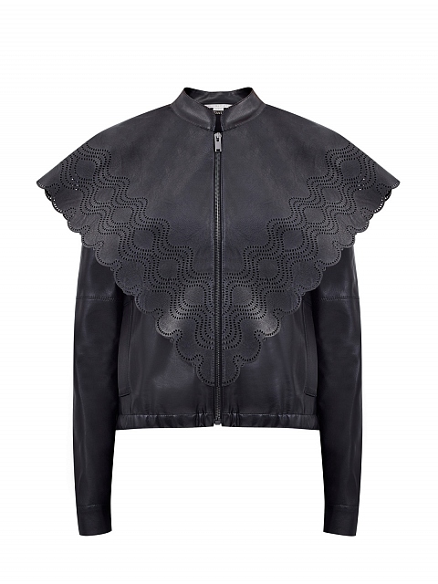 Куртка-жакет от Stella McCartney выполнена из текстурированной эко-кожи Skin Free Skin в рамках концепции бренда «Без жестокости». Характерный для изделия байкерский стиль смягчен кейпом с кружевной перфорацией по краю, которая выполнена при помощи лазера. Изделие с эластичной вставкой по нижней кромке и воротом-стойкой, который делает модель идеальной для межсезонья. Детали: внутренняя отделка из ткани для максимального комфорта, два кармана.