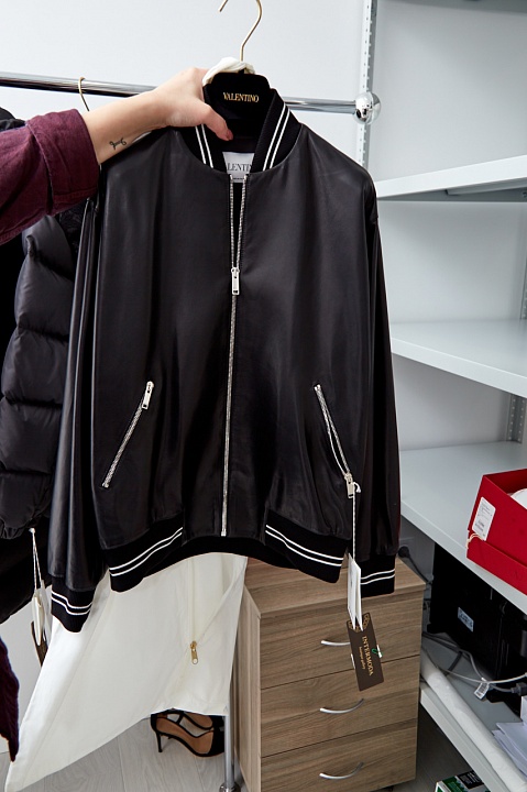 Куртка-бомбер из кожи ягненка с интарсией VLOGO на спинке