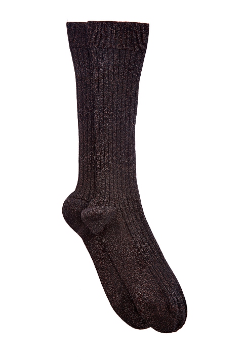 Высокие носки Sparkling от Brunello Cucinelli выполнены из мерцающей пряжи. Глубокий угольный оттенок дополнен нитью люрекса цвета меди. Техника вязки в рубчик подчеркивает сверкающую фактуру материала. Эластичная отделка края обеспечивает комфортную фиксацию. Сделано в Италии.