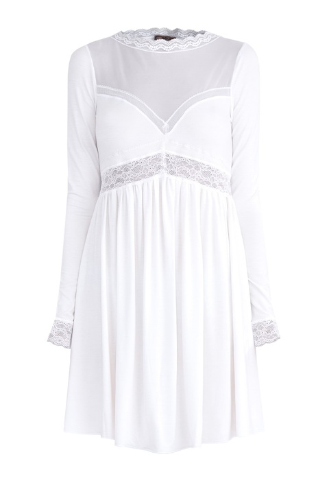 Легкая сорочка Ermanno Scervino приталенного кроя. Модель белоснежного оттенка украшена кружевом ручной работы и полупрозрачной вставкой на груди, создавая романтичный ретро-образ. Юбка длиной мини оформлена множеством ниспадающим мягких складок. Сделано в Италии.