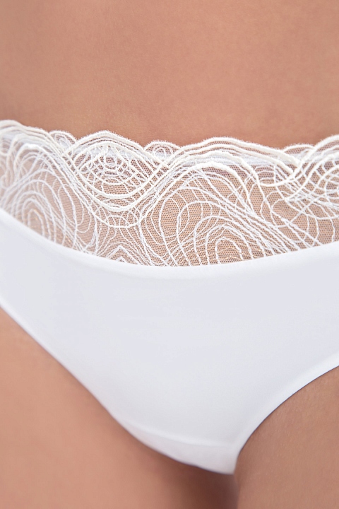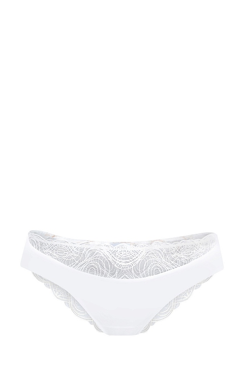 Трусики Elements бренда La Perla с эластичной бесшовной поверхностью белого цвета и тюлевыми вставками с вышивкой металлизированной нитью, созданной под вдохновением от волнообразных линий геологических поперечных сечений. Сделано в Италии.