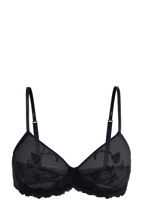 Изящный бюстгальтер La Perla с кружевными чашечками на косточках, без уплотнения. Сетчатая поверхность изделия украшена легкой цветочной вышивкой, выполненной вручную. Бегунки на эластичных бретелях с символикой бренда позволяют индивидуально регулировать плотность прилегания изделия. Произведено в Италии.