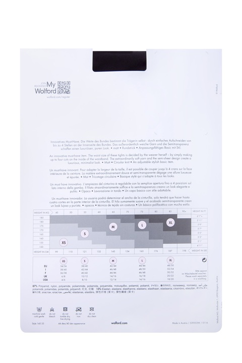 Инновационные колготки «Comfort Cut 40» бренда Wolford, связанные на циркулярных машинах. Модель с непрозрачной поверхностью темного цвета, характеризуется широким, плотным поясом, незаметным под одеждой и позволяющим регулировать объем индивидуально (на внутреннем шве). Сделано в Австрии.