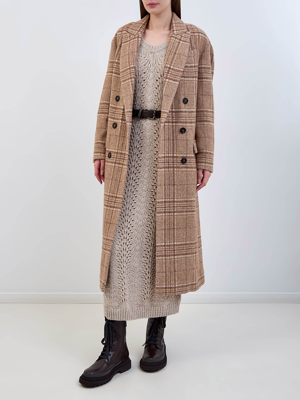 Элегантное двубортное пальто от Brunello Cucinelli сочетает ценную ручную работу и расслабленный стиль. Модель из ворсистой ткани на основе премиальной шерсти и пряжи альпака дополнена классическим узором в крупную клетку. Вышивка рядами цепочек Мониль на спинке подчеркивает изысканный стиль изделия. Детали: широкие лацканы, карманы с бортами. Сделано в Италии.