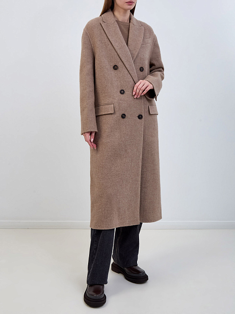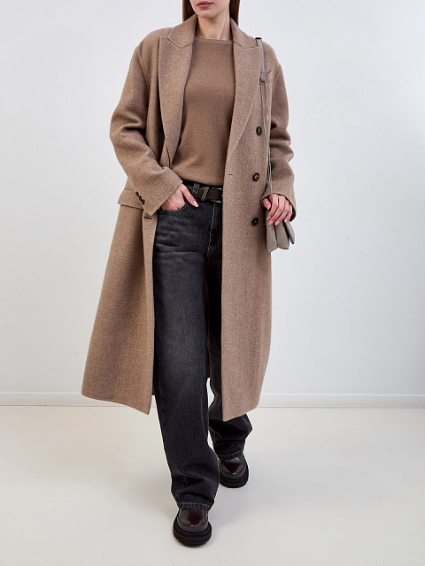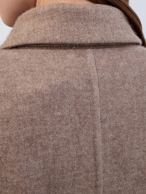 Ценные материалы подчеркивают изысканный и уютный стиль пальто от Brunello Cucinelli. Кашемировая ворсовая ткань представляет собой два соединенных слоя ткани, отделанных таким образом, чтобы создать изделие с плотной и невероятно мягкой в носке текстурой. Свободный крой подчеркнут крупными лацканами, двубортной застежкой и широкими рукавами. Изящная вставка из цепочки Мониль на спинке добавляет нежную сияющую деталь.Сделано в Италии.