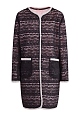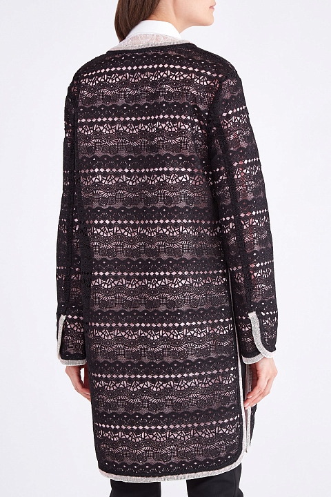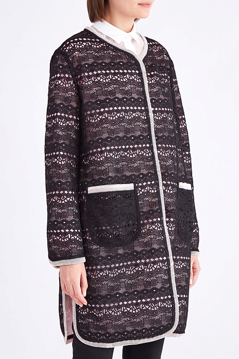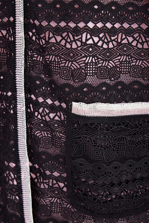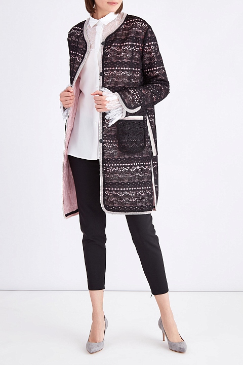 Легкое женское пальто из весенне-летней коллекции Ermanno Scervino выполнено из ажурного кружева элегантного черного тона. Внутренняя часть утеплена слоем плотной синтетической тканью со стеганым узором в нежно-розовом оттенке.Плавные линии кроя подчеркнуты вязаной тесьмой жемчужно-серого тона по кромкам. Декоративные разрезы в боковых швах, а также накладные карманы на передних планках создают образ в расслабленном стиле. Потайная застежка на кнопки завершает изделие. Сделано в Италии.