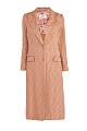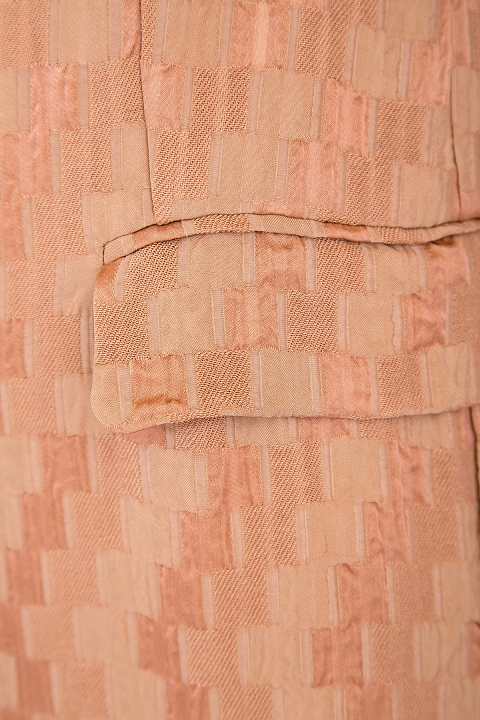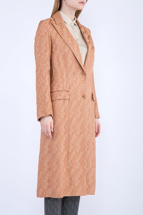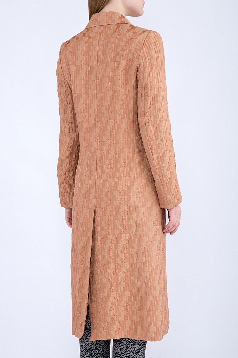 Легкое летнее пальто Etro приталенного кроя с глубоким V-образным вырезом, обрамленным широкими лацканами. Модель выполнена из микса шелка и вискозы, образующими мягкую фактурную поверхность с геометрическим орнаментом в персиковой гамме. Изделие характеризуется частичной шелковой внутренней подкладкой с цветочным узором. Сделано в Италии.