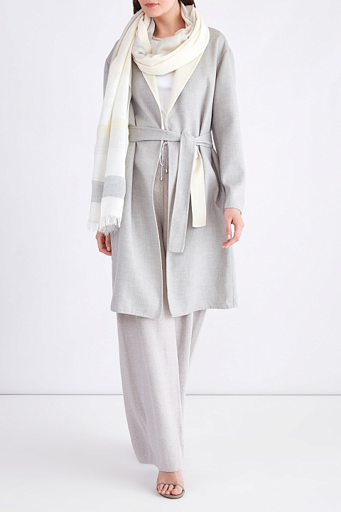 Стильное женское пальто из весенне-летней коллекции Fabiana Filippi выполнено из мягкого кашемира и нежного шелка в пастельном сером оттенке. Внутренняя часть, созданная в деликатном оттенке экрю, вносит в образ цветовой акцент на отложном воротнике с классическими лацканами. Расслабленный стиль изделию придает свободный крой, декоративные разрезы с закругленными краями на рукавах и спущенная линия плеч. Широкий пояс подчеркивает линию талии и формирует гармоничный силуэт. Спинка дополнена высокой шлицей для комфортной посадки. Сделано в Италии.