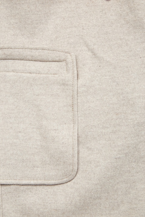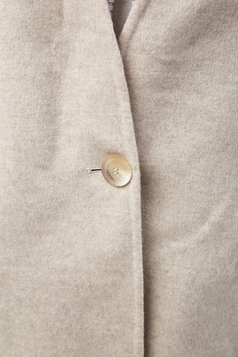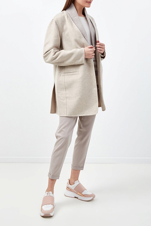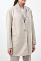 Лаконичное пальто от Fabiana Filippi создано в базовом бежевом оттенке из плотного драпа на основе шерсти и кашемира. Свободный силуэт идеально подходит для создания многослойных образов. Особенностью изделия стал съемный вязаный воротник, который делает дизайн еще более универсальным. Строгость линиям придают прорезные карманы с бортами, один из которых расшит нитью фирменных бусин. Детали: без подкладки, длина по спинке 80 см. Сделано в Италии.