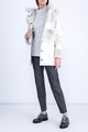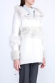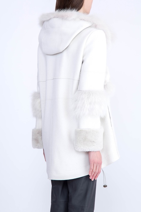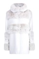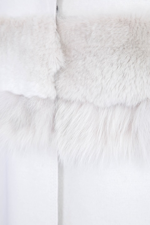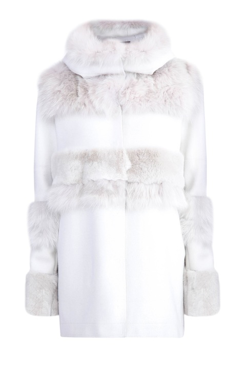 Уютное женское пальто Lorena Antoniazzi прямого кроя, выполненное из твида в составе шерсти и кашемира белого цвета. Модель характеризуется декоративной отделкой в виде горизонтальных полос лисьего меха и меха кролика в двух натуральных оттенках. Нижняя асимметричная кромка дополнена кулиской. Сделано в Италии.