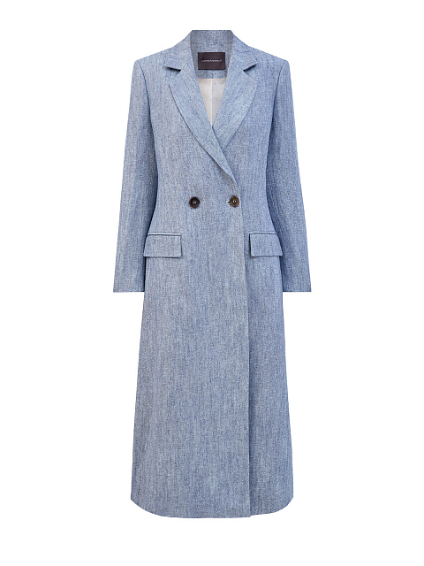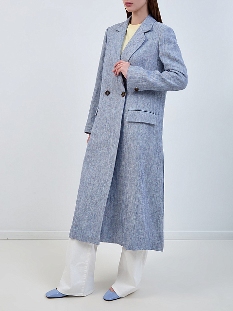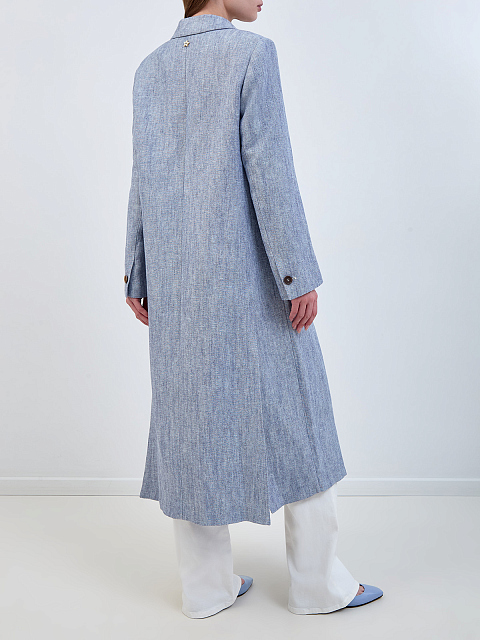 Элегантное пальто от Lorena Antoniazzi сочетает ручную работу, благородные материалы и женственный силуэт. Двубортная модель создана из смесового льна в меланжево-голубом оттенке. Отложной ворот с лацканами, прорезные карманы и две высокие шлицы на спинке подчеркивают расслабленный стиль изделия. Детали: символика бренда на спинке, подкладка из ацетата. Сделано в Италии.