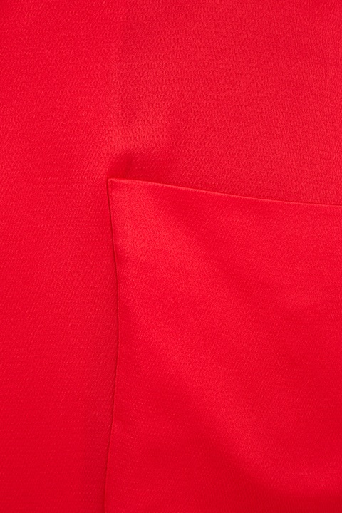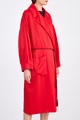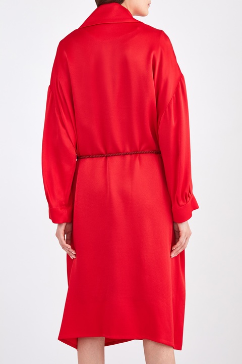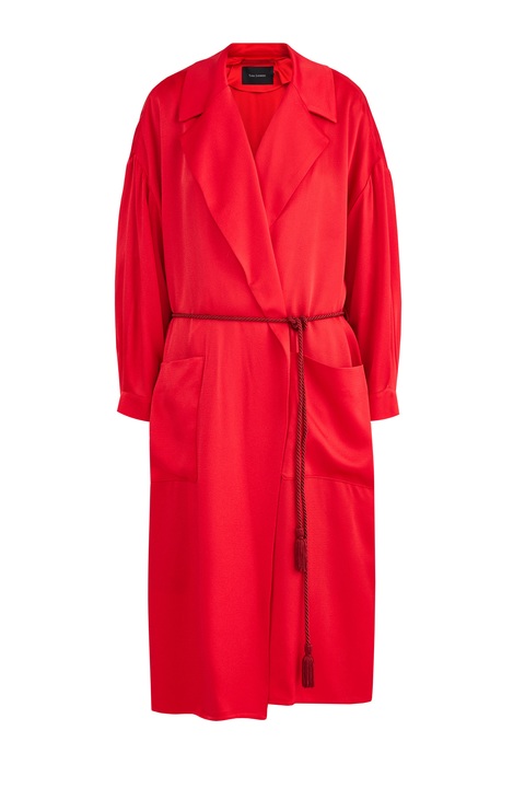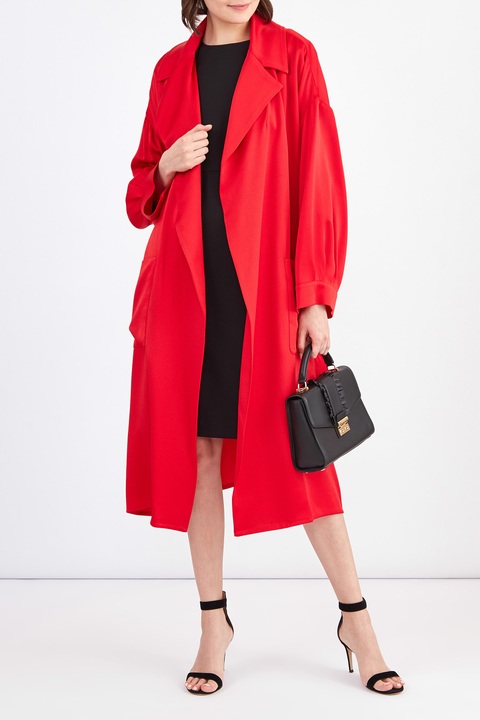 Легкое летнее женское пальто из коллекции Tara Jarmon, характеризующиеся свободным кроем с широкими лацканами, накладными карманами и длинными рукавами со заниженной линией плеч. Модель создана из мягкой ткани в составе ацетатного шелка и вискозы с матовой фактурной поверхностью насыщенного алого цвета. Изделие без застежек завершает тонкий плетеный пояс-шнурок с кисточками на концах.