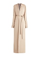Минималистичный женский плащ длины макси из весенне-летней коллекции Alexander Terekhov создан из струящейся ткани на основе мягкой вискозы и нежного шелка с мягким атласным блеском в деликатном сливочно-бежевом оттенке. Модель стилизована под кимоно и оснащена аутентичным шалевым воротом и съемным широким поясом-лентой, который подчеркивает талию и формирует гармоничный силуэт. Изделие дополнено двумя прорезными карманами с широкими бортами и внутренней подкладкой в тон для посадки по фигуре. Сделано в России.
