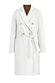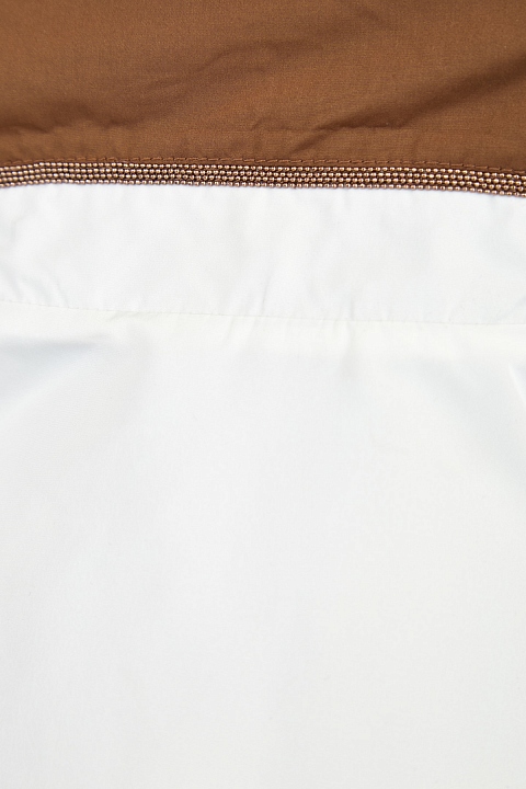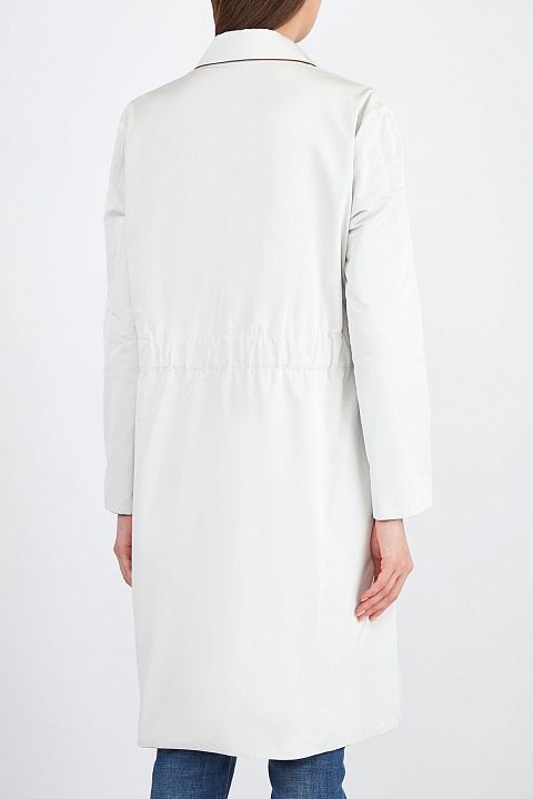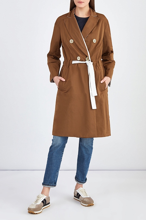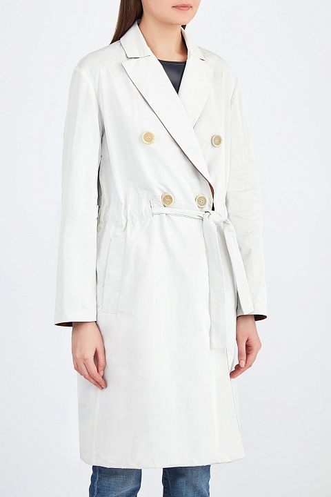 Двусторонний женский плащ из коллекции Brunello Cucinelli свободного кроя с длинными рукавами и английским воротником. Модель создана из плотной тафты в составе шелка и технических волокон с матовой поверхностью серовато-белого и коричневого цветов. Изделие характеризуется двубортной пуговичной застежкой и вшитым поясом, который подчеркивает талию. Сделано в Италии.