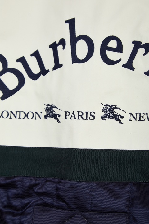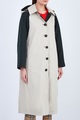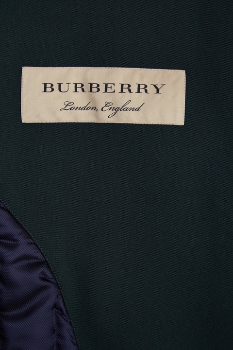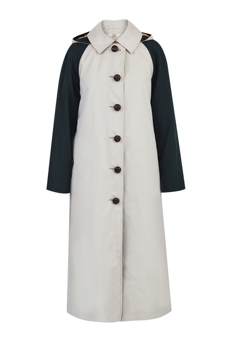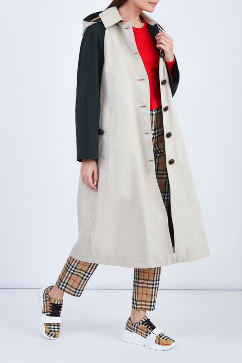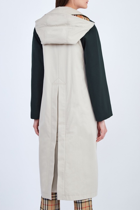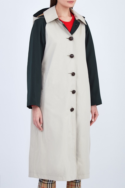 Стильный женский плащ от Burberry свободного трапециевидного кроя с контрастными рукавами-реглан и капюшоном, дополняющим отложной воротник. Модель сшита из плотного хлопкового габардина серо-бежевого цвета на основной части и яркого изумрудно-зеленого тона на рукавах. Стиль милитари подчеркнут объемной бантовой складкой на спинке и особыми плетеными пуговицами из кожи.