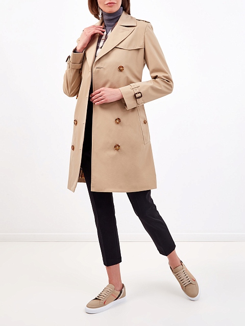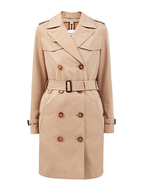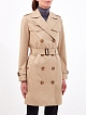 Культовый женский тренч от Burberry выполнен из плотного хлопкового габардина в бежевом оттенке. В процессе создания изделие проходит 26 этапов проверки, что обеспечивает надежную защиту от износа и идеальную посадку по фигуре. Двубортная модель дополнена широким съемным поясом и узнаваемым принтом Vintage Check на подкладке. Детали: отложной ворот с лацканами, карманы с бортами, черепаховая фурнитура.