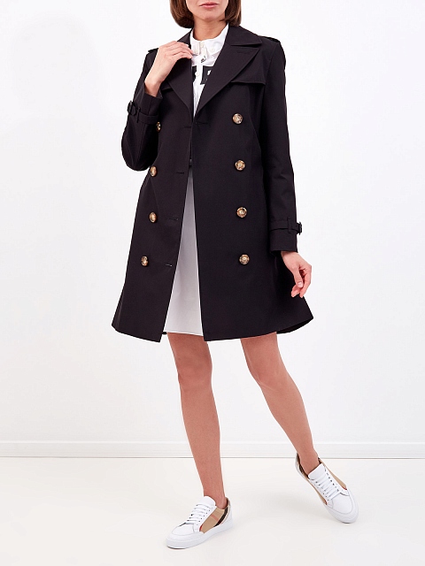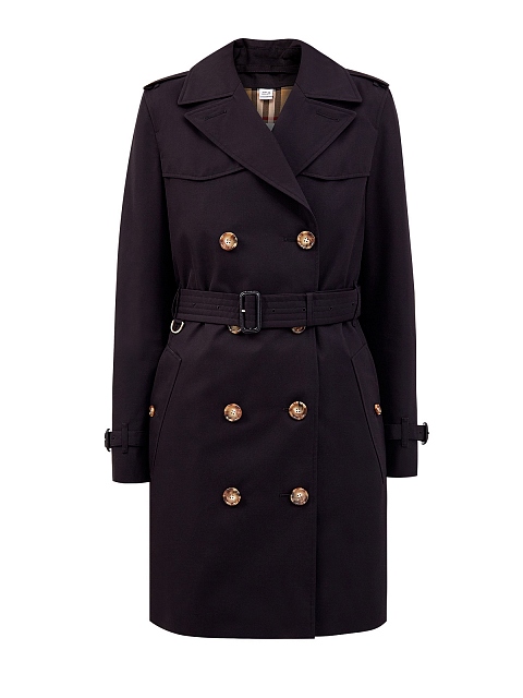 Двубортный тренч в классическом черном цвете от Burberry полностью выполнен из гладкого хлопкового габардина. Культовая модель дополнена широким съемным поясом и узнаваемым принтом Vintage Check на подкладке. В процессе создания изделие проходит 26 этапов проверки, что обеспечивает надежную защиту от износа и идеальную посадку по фигуре. Детали: черепаховая фурнитура, отложной ворот с лацканами, карманы с бортами.