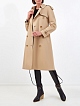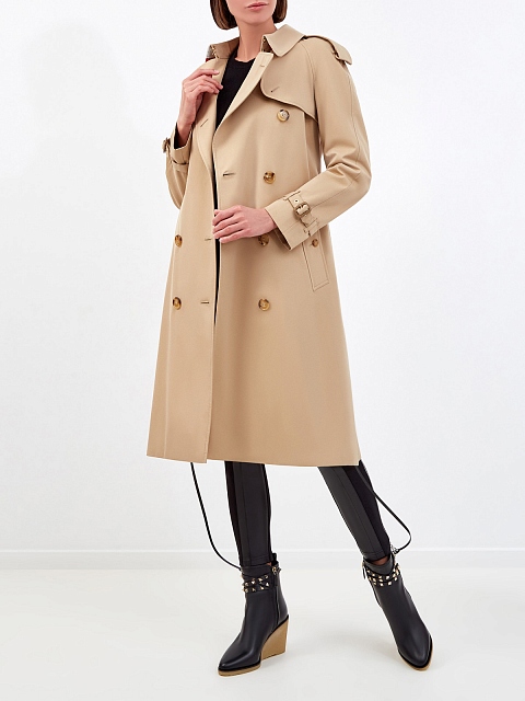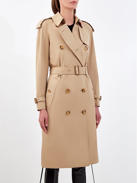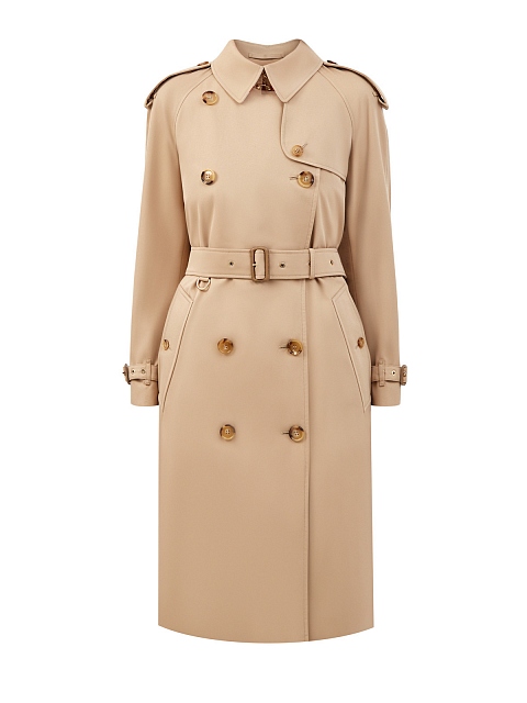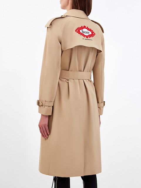 Классический тренчкот от Burberry создан из английского хлопкового габардина в культовом медовом оттенке. Кокетка на спинке, отделка под воротом и подкладка дополнены узором Society, воссозданным по мотивам архивов 1991 года. Пряжки традиционно обтянуты плотной телячьей кожей, вырез дополнен крючком-фиксатором. Детали: рукава-реглан с патами на манжетах, пуговицы из рога, двубортная застежка.